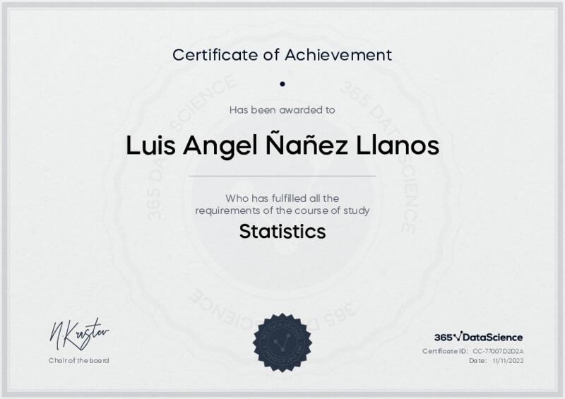 This user has been awarded the Statistics Certificate for successfully completing the course exam. Holding this certificate demonstrates their proficiency on the topic and signifies they are qualified to apply their newly acquired expertise in the fields of data analytics and data science.