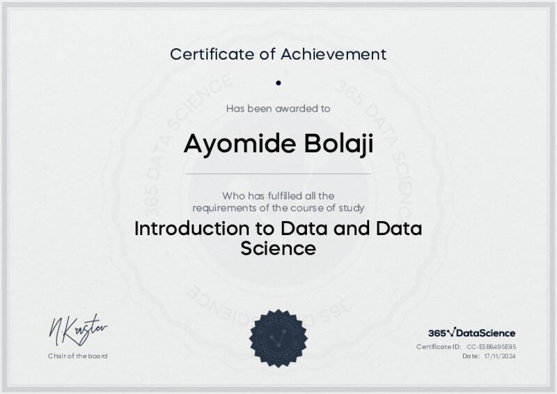 This user has been awarded the Introduction to Data and Data Science Certificate for successfully completing the course exam. Holding this certificate demonstrates their proficiency on the topic and signifies they are qualified to apply their newly acquired expertise in the fields of data analytics and data science.