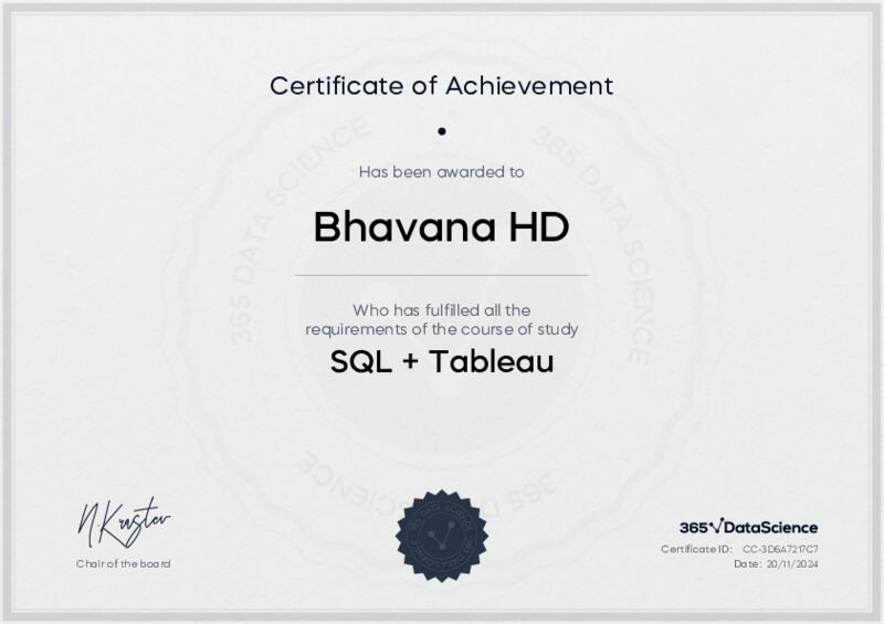 This user has been awarded the SQL + Tableau Certificate for successfully completing the course exam. Holding this certificate demonstrates their proficiency on the topic and signifies they are qualified to apply their newly acquired expertise in the fields of data analytics and data science.