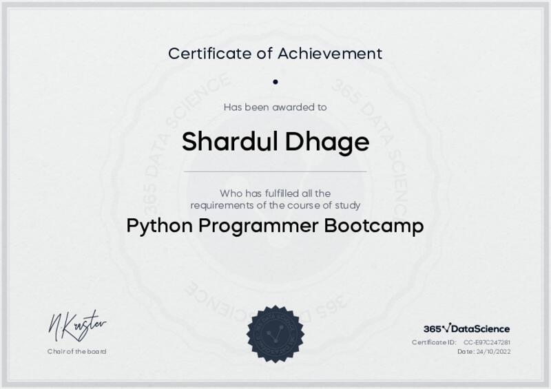 This user has been awarded the Python Programmer Bootcamp Certificate for successfully completing the course exam. Holding this certificate demonstrates their proficiency on the topic and signifies they are qualified to apply their newly acquired expertise in the fields of data analytics and data science.