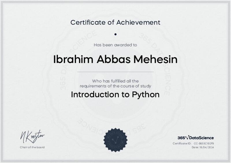 This user has been awarded the Introduction to Python Certificate for successfully completing the course exam. Holding this certificate demonstrates their proficiency on the topic and signifies they are qualified to apply their newly acquired expertise in the fields of data analytics and data science.