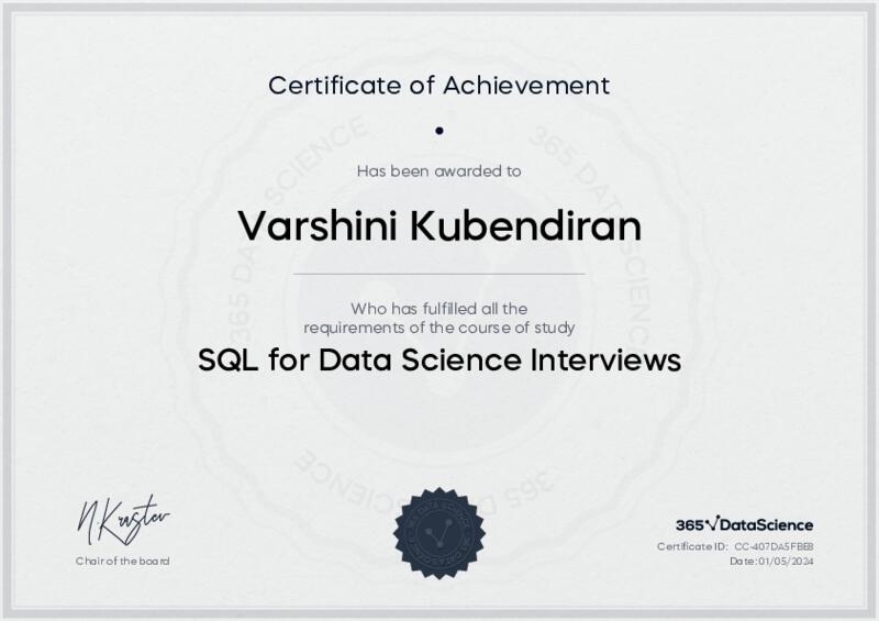 This user has been awarded the SQL for Data Science Interviews Certificate for successfully completing the course exam. Holding this certificate demonstrates their proficiency on the topic and signifies they are qualified to apply their newly acquired expertise in the fields of data analytics and data science.