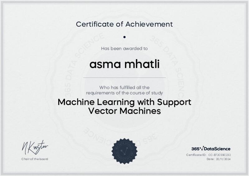 This user has been awarded the Machine Learning with Support Vector Machines Certificate for successfully completing the course exam. Holding this certificate demonstrates their proficiency on the topic and signifies they are qualified to apply their newly acquired expertise in the fields of data analytics and data science.