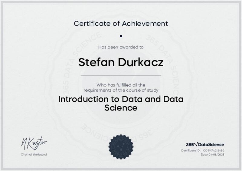 This user has been awarded the Introduction to Data and Data Science Certificate for successfully completing the course exam. Holding this certificate demonstrates their proficiency on the topic and signifies they are qualified to apply their newly acquired expertise in the fields of data analytics and data science.