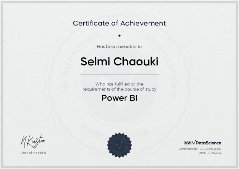 This user has been awarded the Power BI Certificate for successfully completing the course exam. Holding this certificate demonstrates their proficiency on the topic and signifies they are qualified to apply their newly acquired expertise in the fields of data analytics and data science.