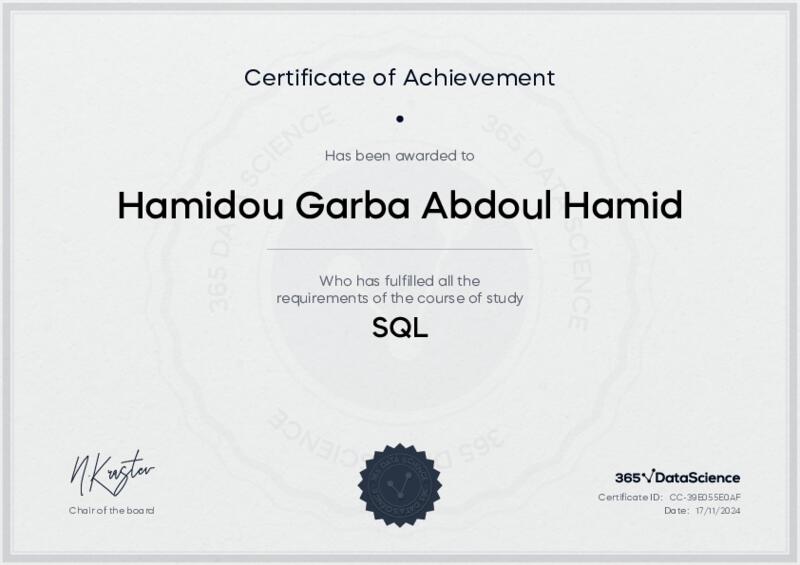 This user has been awarded the SQL Certificate for successfully completing the course exam. Holding this certificate demonstrates their proficiency on the topic and signifies they are qualified to apply their newly acquired expertise in the fields of data analytics and data science.