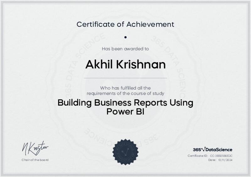 This user has been awarded the Building Business Reports Using Power BI Certificate for successfully completing the course exam. Holding this certificate demonstrates their proficiency on the topic and signifies they are qualified to apply their newly acquired expertise in the fields of data analytics and data science.