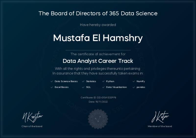 This user has been awarded the Data Analyst Career Track Certificate for successfully completing all courses and assessments. This certificate confirms their technical expertise and professional credibility to work as a data analyst.
