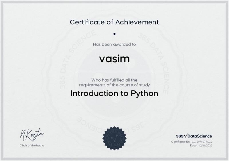 This user has been awarded the Introduction to Python Certificate for successfully completing the course exam. Holding this certificate demonstrates their proficiency on the topic and signifies they are qualified to apply their newly acquired expertise in the fields of data analytics and data science.