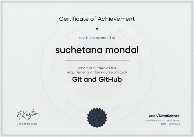 This user has been awarded the Git and GitHub Certificate for successfully completing the course exam. Holding this certificate demonstrates their proficiency on the topic and signifies they are qualified to apply their newly acquired expertise in the fields of data analytics and data science.