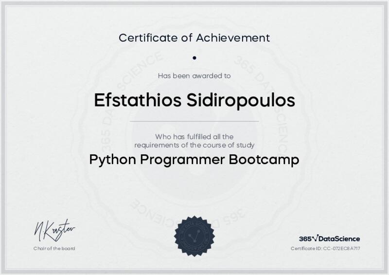 This user has been awarded the Python Programmer Bootcamp Certificate for successfully completing the course exam. Holding this certificate demonstrates their proficiency on the topic and signifies they are qualified to apply their newly acquired expertise in the fields of data analytics and data science.