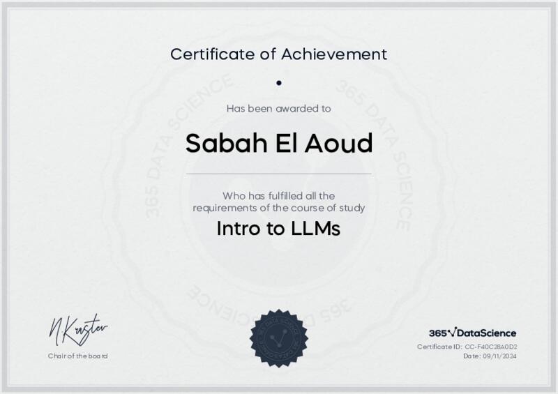 This user has been awarded the Intro to LLMs Certificate for successfully completing the course exam. Holding this certificate demonstrates their proficiency on the topic and signifies they are qualified to apply their newly acquired expertise in the fields of data analytics and data science.