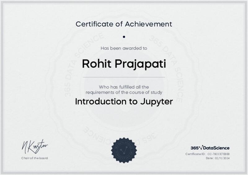 This user has been awarded the Introduction to Jupyter Certificate for successfully completing the course exam. Holding this certificate demonstrates their proficiency on the topic and signifies they are qualified to apply their newly acquired expertise in the fields of data analytics and data science.