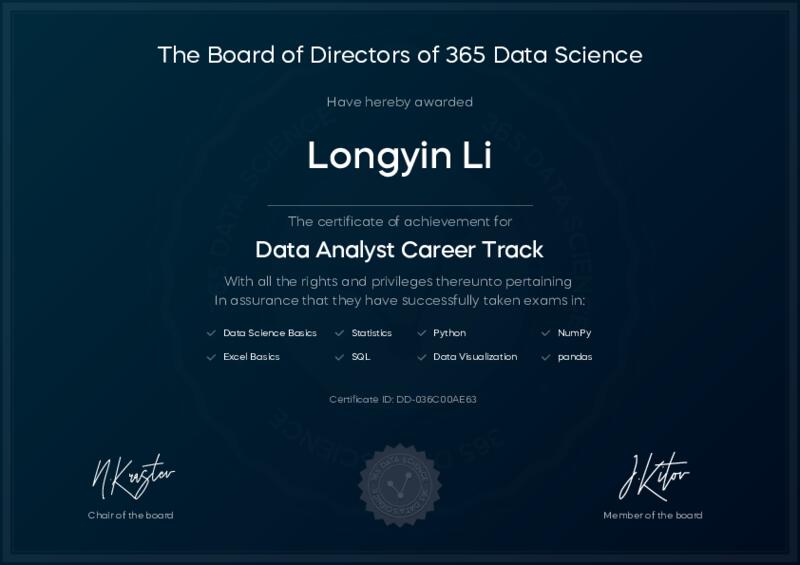 This user has been awarded the Data Analyst Career Track Certificate for successfully completing all courses and assessments. This certificate confirms their technical expertise and professional credibility to work as a data analyst.