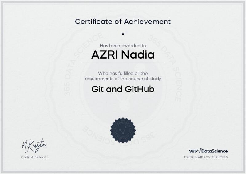This user has been awarded the Git and GitHub Certificate for successfully completing the course exam. Holding this certificate demonstrates their proficiency on the topic and signifies they are qualified to apply their newly acquired expertise in the fields of data analytics and data science.