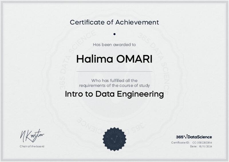 This user has been awarded the Intro to Data Engineering Certificate for successfully completing the course exam. Holding this certificate demonstrates their proficiency on the topic and signifies they are qualified to apply their newly acquired expertise in the fields of data analytics and data science.