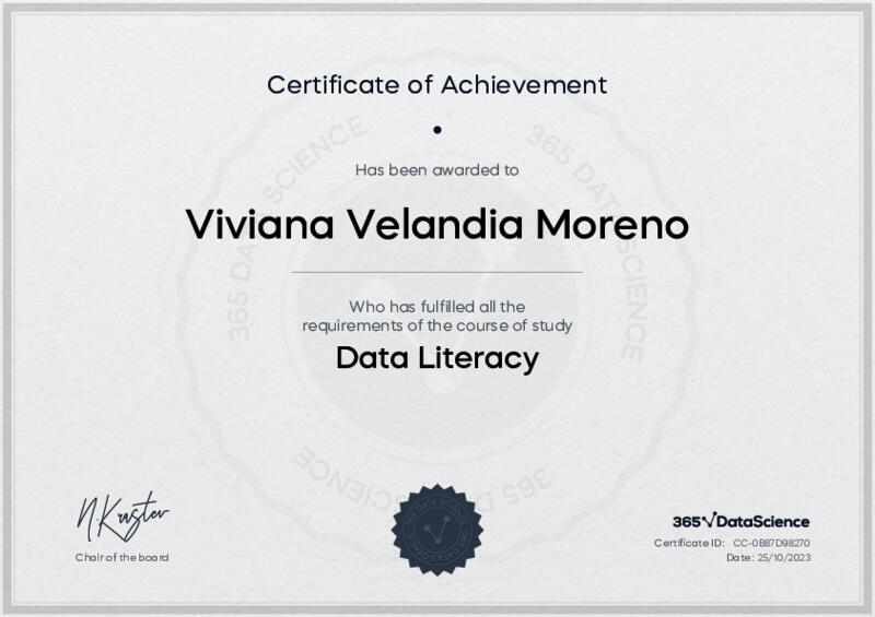 This user has been awarded the Data Literacy Certificate for successfully completing the course exam. Holding this certificate demonstrates their proficiency on the topic and signifies they are qualified to apply their newly acquired expertise in the fields of data analytics and data science.