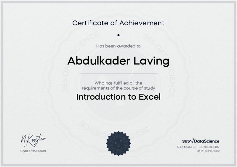 This user has been awarded the Introduction to Excel Certificate for successfully completing the course exam. Holding this certificate demonstrates their proficiency on the topic and signifies they are qualified to apply their newly acquired expertise in the fields of data analytics and data science.