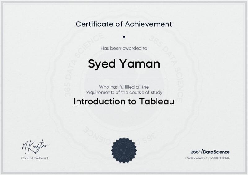 This user has been awarded the Introduction to Tableau Certificate for successfully completing the course exam. Holding this certificate demonstrates their proficiency on the topic and signifies they are qualified to apply their newly acquired expertise in the fields of data analytics and data science.