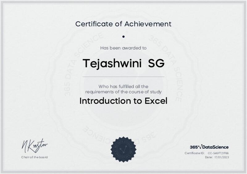 This user has been awarded the Introduction to Excel Certificate for successfully completing the course exam. Holding this certificate demonstrates their proficiency on the topic and signifies they are qualified to apply their newly acquired expertise in the fields of data analytics and data science.