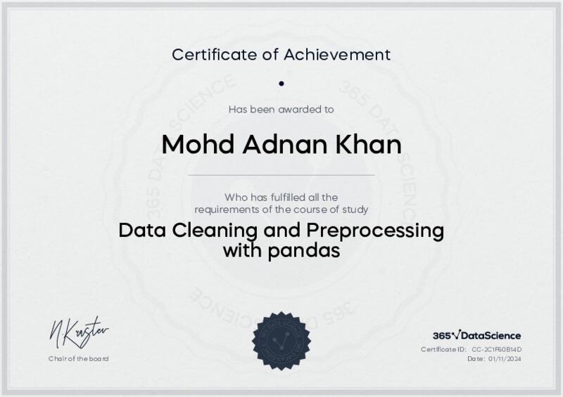 This user has been awarded the Data Cleaning and Preprocessing with pandas Certificate for successfully completing the course exam. Holding this certificate demonstrates their proficiency on the topic and signifies they are qualified to apply their newly acquired expertise in the fields of data analytics and data science.