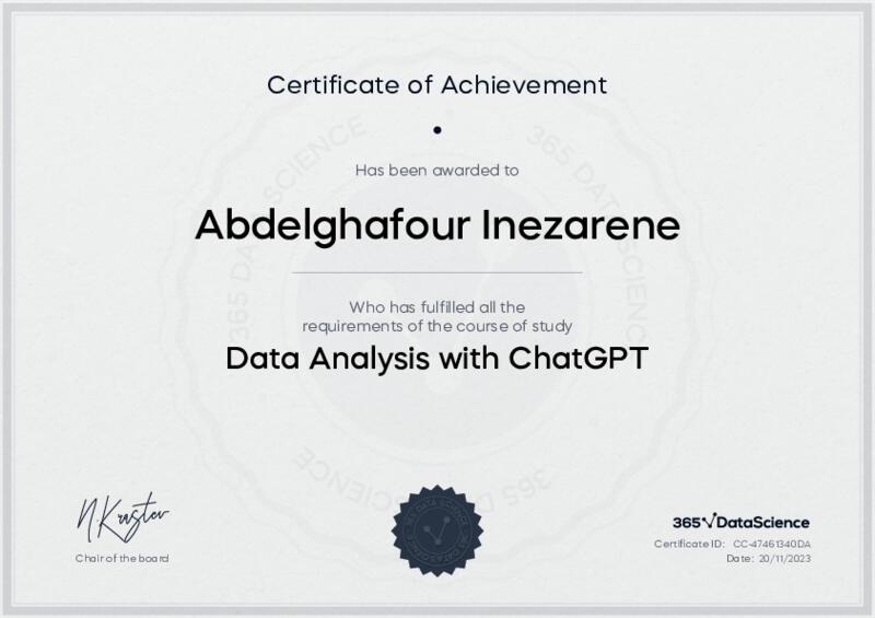 This user has been awarded the Data Analysis with ChatGPT Certificate for successfully completing the course exam. Holding this certificate demonstrates their proficiency on the topic and signifies they are qualified to apply their newly acquired expertise in the fields of data analytics and data science.