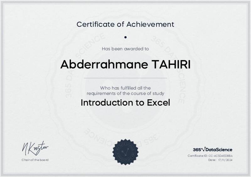 This user has been awarded the Introduction to Excel Certificate for successfully completing the course exam. Holding this certificate demonstrates their proficiency on the topic and signifies they are qualified to apply their newly acquired expertise in the fields of data analytics and data science.