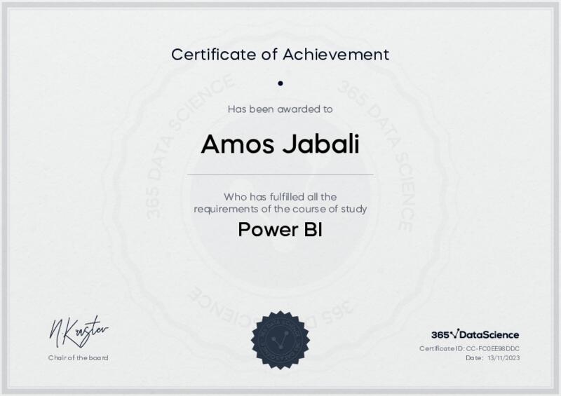 This user has been awarded the Power BI Certificate for successfully completing the course exam. Holding this certificate demonstrates their proficiency on the topic and signifies they are qualified to apply their newly acquired expertise in the fields of data analytics and data science.