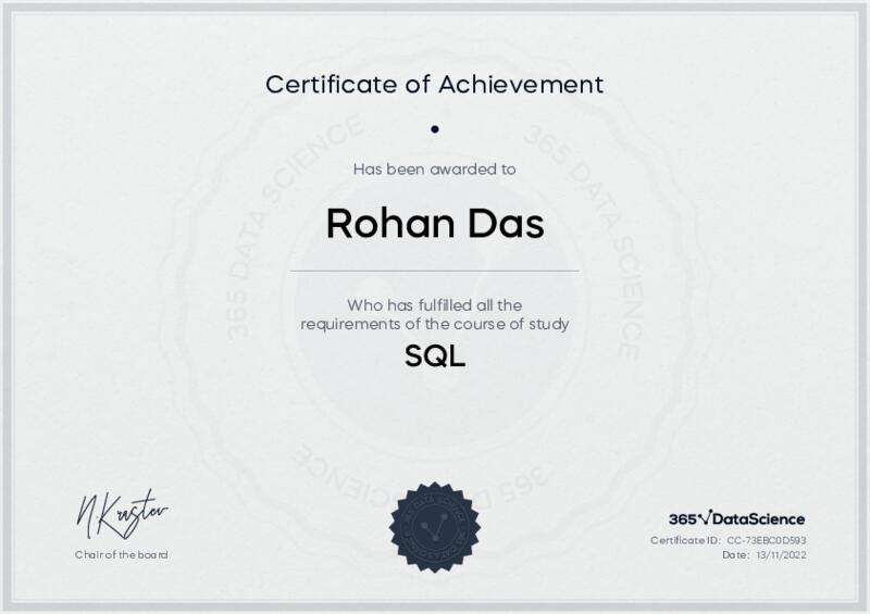 This user has been awarded the SQL Certificate for successfully completing the course exam. Holding this certificate demonstrates their proficiency on the topic and signifies they are qualified to apply their newly acquired expertise in the fields of data analytics and data science.