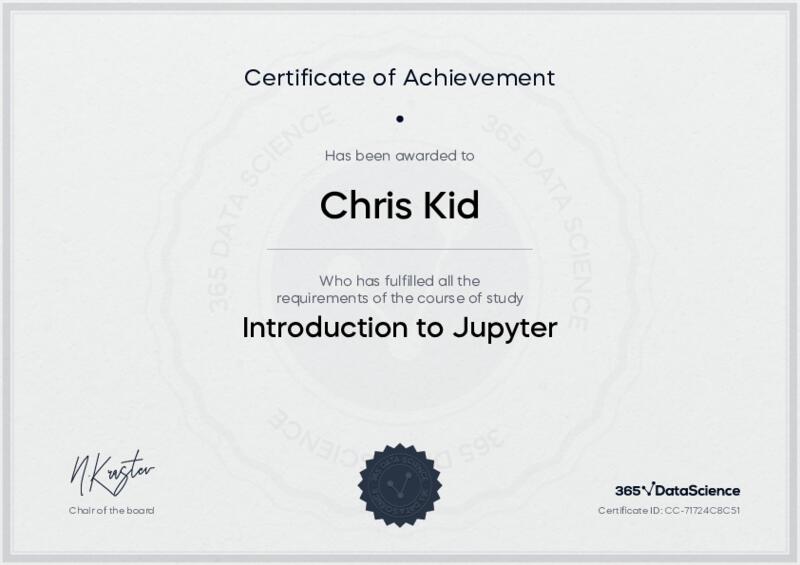 This user has been awarded the Introduction to Jupyter Certificate for successfully completing the course exam. Holding this certificate demonstrates their proficiency on the topic and signifies they are qualified to apply their newly acquired expertise in the fields of data analytics and data science.