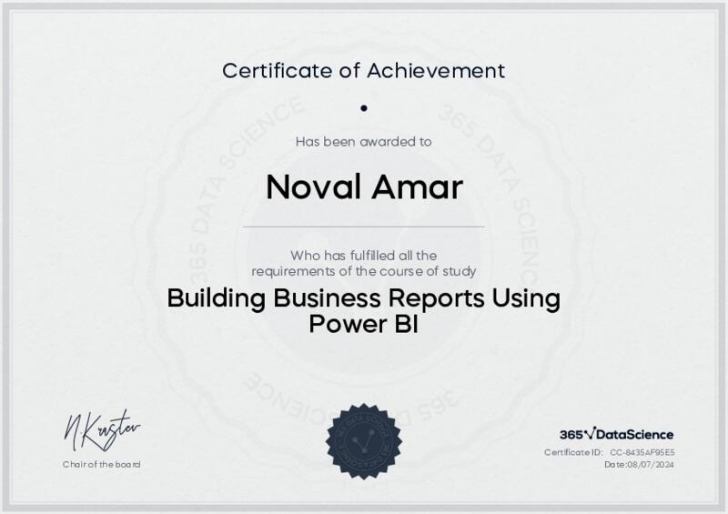 This user has been awarded the Building Business Reports Using Power BI Certificate for successfully completing the course exam. Holding this certificate demonstrates their proficiency on the topic and signifies they are qualified to apply their newly acquired expertise in the fields of data analytics and data science.