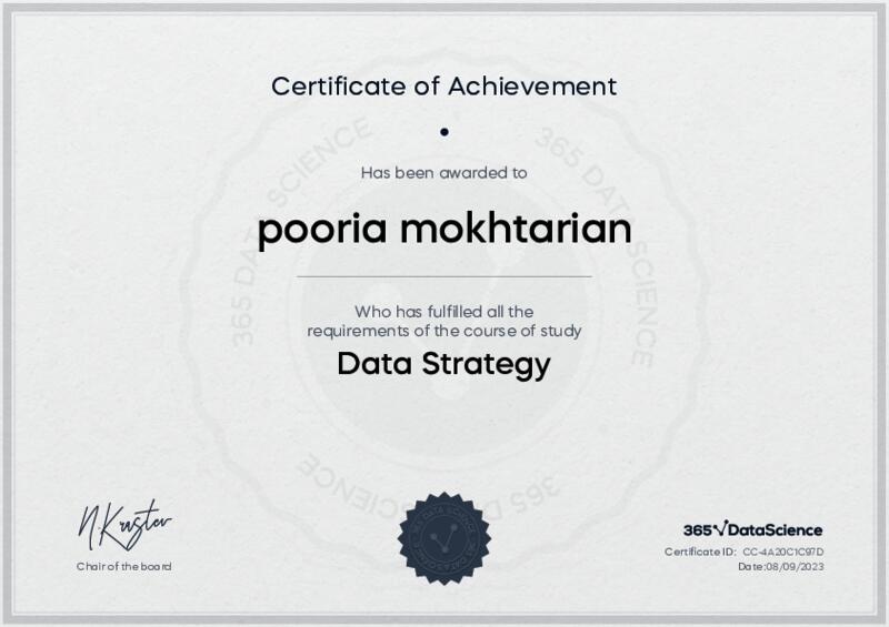 This user has been awarded the Data Strategy Certificate for successfully completing the course exam. Holding this certificate demonstrates their proficiency on the topic and signifies they are qualified to apply their newly acquired expertise in the fields of data analytics and data science.