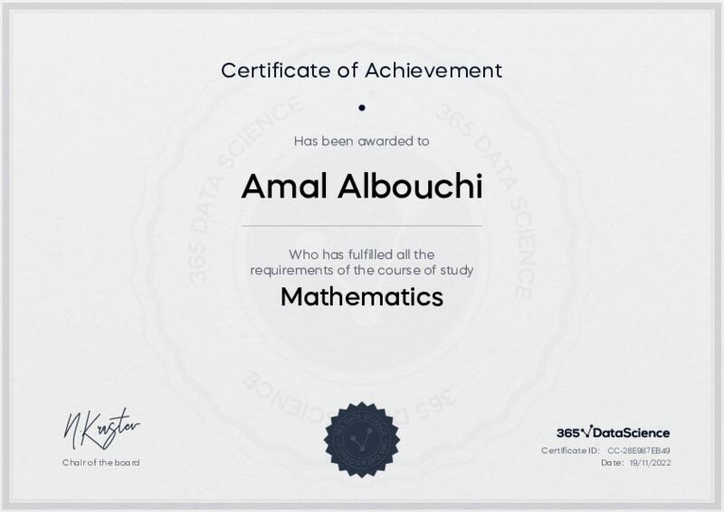 This user has been awarded the Mathematics Certificate for successfully completing the course exam. Holding this certificate demonstrates their proficiency on the topic and signifies they are qualified to apply their newly acquired expertise in the fields of data analytics and data science.