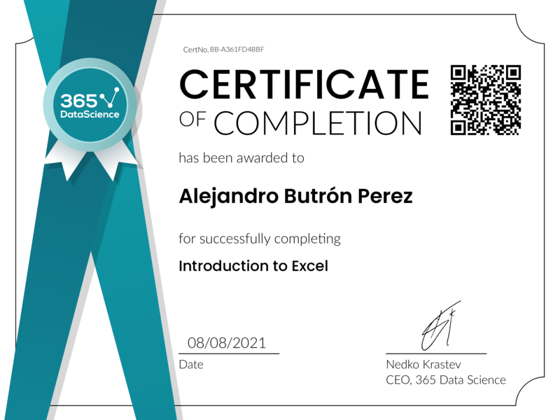 Congratulations! You have been awarded the 365 Data Science Certificate for successfully completing this course. Holding this certificate demonstrates your proficiency on the topic and your ability to apply your newly acquired expertise in the fields of data analytics and data science with confidence.