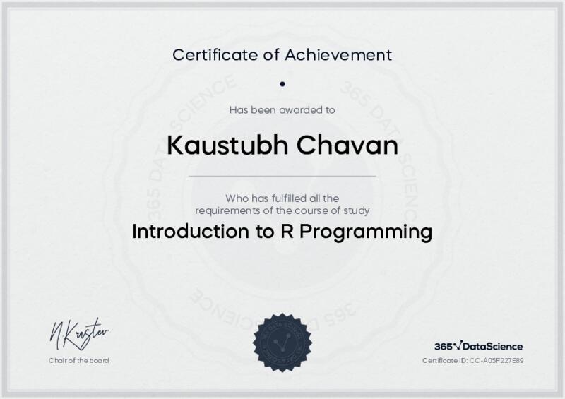 This user has been awarded the Introduction to R Programming Certificate for successfully completing the course exam. Holding this certificate demonstrates their proficiency on the topic and signifies they are qualified to apply their newly acquired expertise in the fields of data analytics and data science.