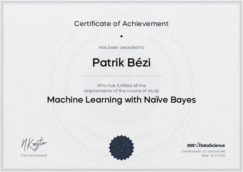 This user has been awarded the Machine Learning with Naïve Bayes Certificate for successfully completing the course exam. Holding this certificate demonstrates their proficiency on the topic and signifies they are qualified to apply their newly acquired expertise in the fields of data analytics and data science.