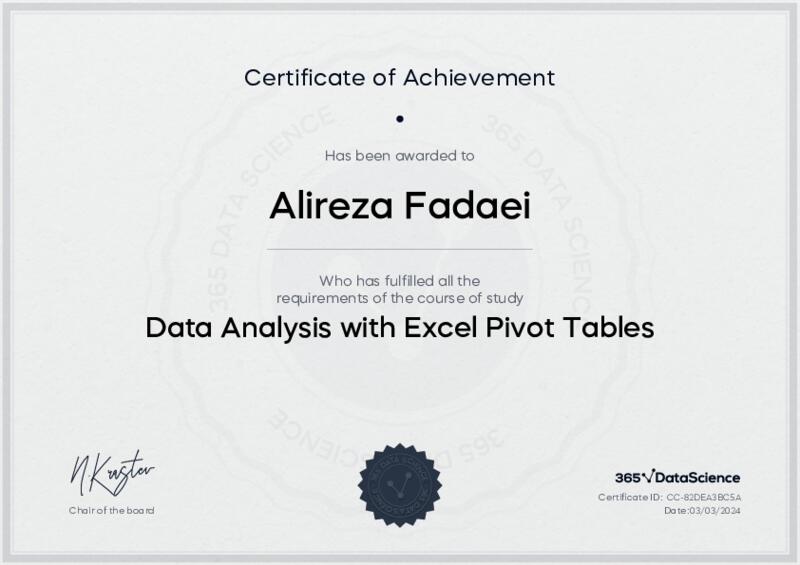 This user has been awarded the Data Analysis with Excel Pivot Tables Certificate for successfully completing the course exam. Holding this certificate demonstrates their proficiency on the topic and signifies they are qualified to apply their newly acquired expertise in the fields of data analytics and data science.