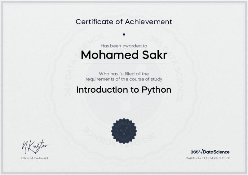 This user has been awarded the Introduction to Python Certificate for successfully completing the course exam. Holding this certificate demonstrates their proficiency on the topic and signifies they are qualified to apply their newly acquired expertise in the fields of data analytics and data science.