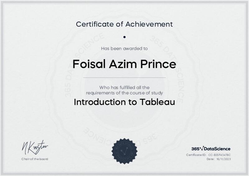 This user has been awarded the Introduction to Tableau Certificate for successfully completing the course exam. Holding this certificate demonstrates their proficiency on the topic and signifies they are qualified to apply their newly acquired expertise in the fields of data analytics and data science.
