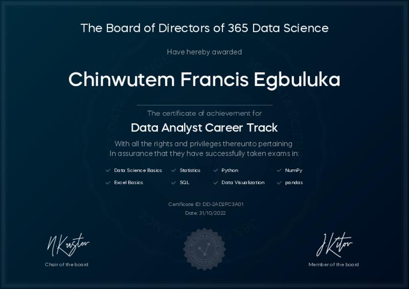 This user has been awarded the Data Analyst Career Track Certificate for successfully completing all courses and assessments. This certificate confirms their technical expertise and professional credibility to work as a data analyst.
