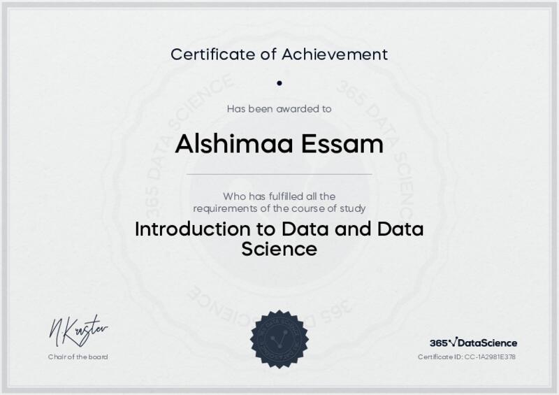 This user has been awarded the Introduction to Data and Data Science Certificate for successfully completing the course exam. Holding this certificate demonstrates their proficiency on the topic and signifies they are qualified to apply their newly acquired expertise in the fields of data analytics and data science.