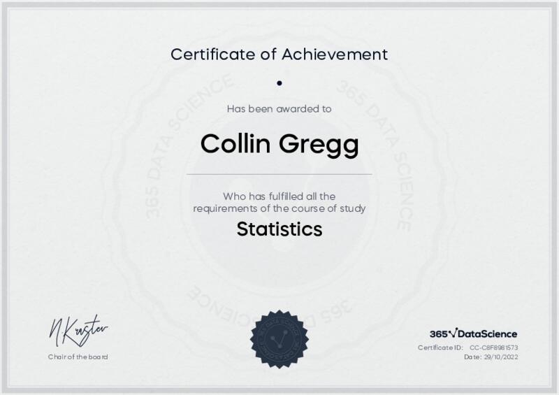 This user has been awarded the Statistics Certificate for successfully completing the course exam. Holding this certificate demonstrates their proficiency on the topic and signifies they are qualified to apply their newly acquired expertise in the fields of data analytics and data science.