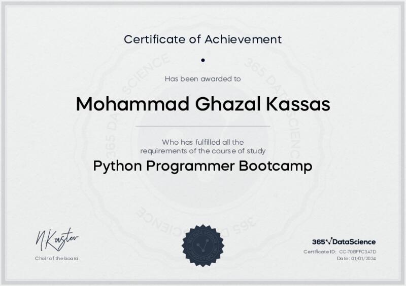 This user has been awarded the Python Programmer Bootcamp Certificate for successfully completing the course exam. Holding this certificate demonstrates their proficiency on the topic and signifies they are qualified to apply their newly acquired expertise in the fields of data analytics and data science.