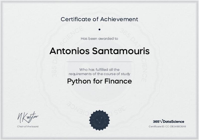 This user has been awarded the Python for Finance Certificate for successfully completing the course exam. Holding this certificate demonstrates their proficiency on the topic and signifies they are qualified to apply their newly acquired expertise in the fields of data analytics and data science.