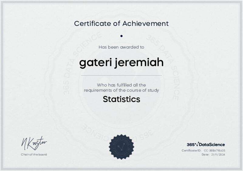 This user has been awarded the Statistics Certificate for successfully completing the course exam. Holding this certificate demonstrates their proficiency on the topic and signifies they are qualified to apply their newly acquired expertise in the fields of data analytics and data science.
