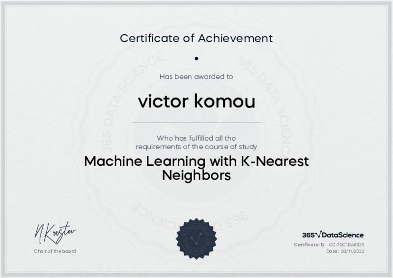 This user has been awarded the Machine Learning with K-Nearest Neighbors Certificate for successfully completing the course exam. Holding this certificate demonstrates their proficiency on the topic and signifies they are qualified to apply their newly acquired expertise in the fields of data analytics and data science.