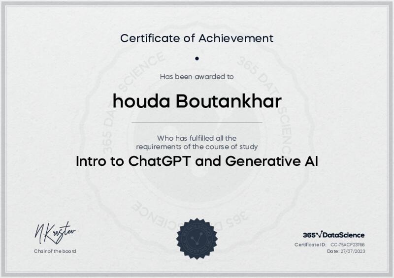 This user has been awarded the Intro to ChatGPT and Generative AI Certificate for successfully completing the course exam. Holding this certificate demonstrates their proficiency on the topic and signifies they are qualified to apply their newly acquired expertise in the fields of data analytics and data science.
