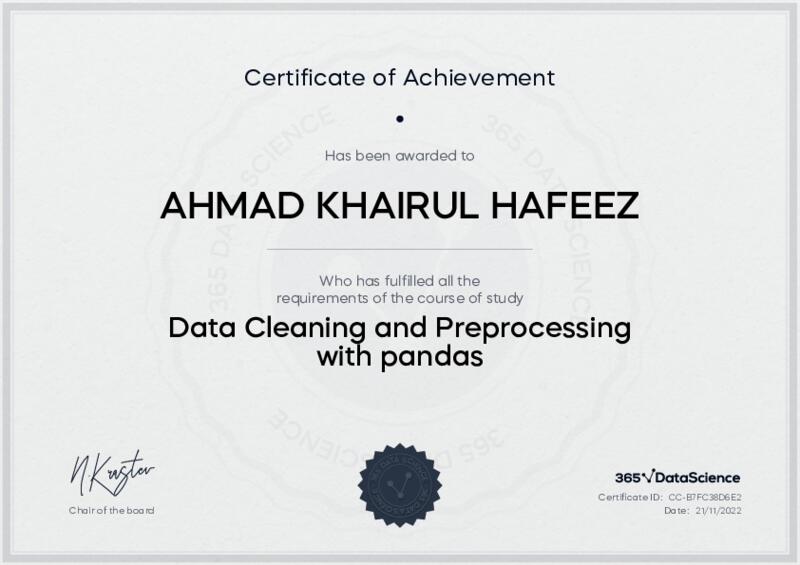 This user has been awarded the Data Cleaning and Preprocessing with pandas Certificate for successfully completing the course exam. Holding this certificate demonstrates their proficiency on the topic and signifies they are qualified to apply their newly acquired expertise in the fields of data analytics and data science.