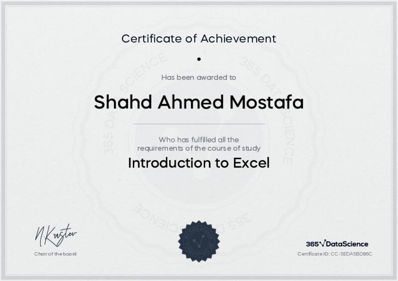 This user has been awarded the Introduction to Excel Certificate for successfully completing the course exam. Holding this certificate demonstrates their proficiency on the topic and signifies they are qualified to apply their newly acquired expertise in the fields of data analytics and data science.