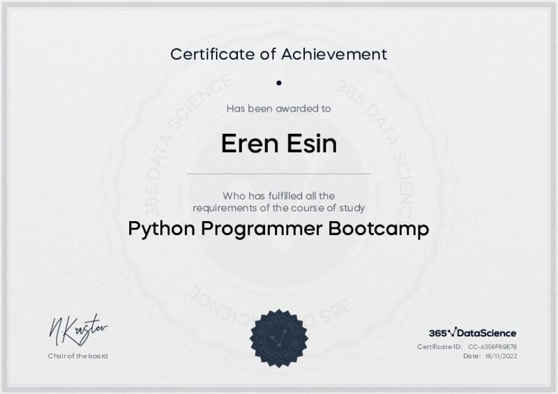 This user has been awarded the Python Programmer Bootcamp Certificate for successfully completing the course exam. Holding this certificate demonstrates their proficiency on the topic and signifies they are qualified to apply their newly acquired expertise in the fields of data analytics and data science.